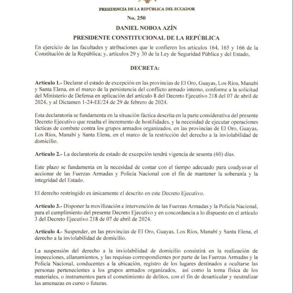 «El estado ecuatoriano se encuentra enfrentando un conflicto armado interno cuyas reglas son propias y aplicables a las partes en conflicto, sin embargo para complementar las operaciones militares es necesario utilizar una figura excepcional y extraordinaria aplicable a todos los ciudadanos para suspender su derecho a la inviolabilidad de domicilio, y de esa forma complementar las operaciones militares en curso», indica el decreto.