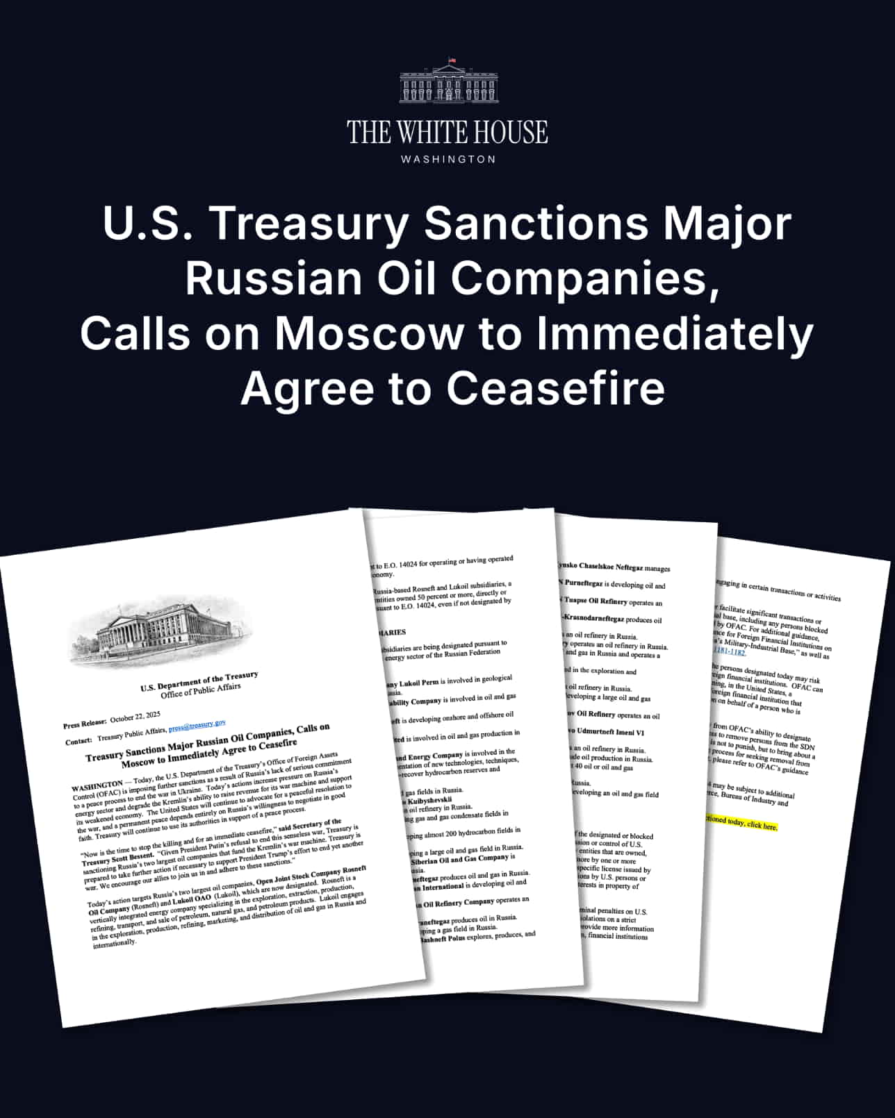 Tras la suspensión de la cumbre de Budapest entre Putin y Trump, la Oficina de Control de Activos Extranjeros (OFAC) del Tesoro de Estados Unidos informa que impone nuevas sanciones a petroleras rusas como consecuencia de lo que definió como una «falta de compromiso serio por parte de Rusia con el proceso de paz para poner fin a la guerra en Ucrania».