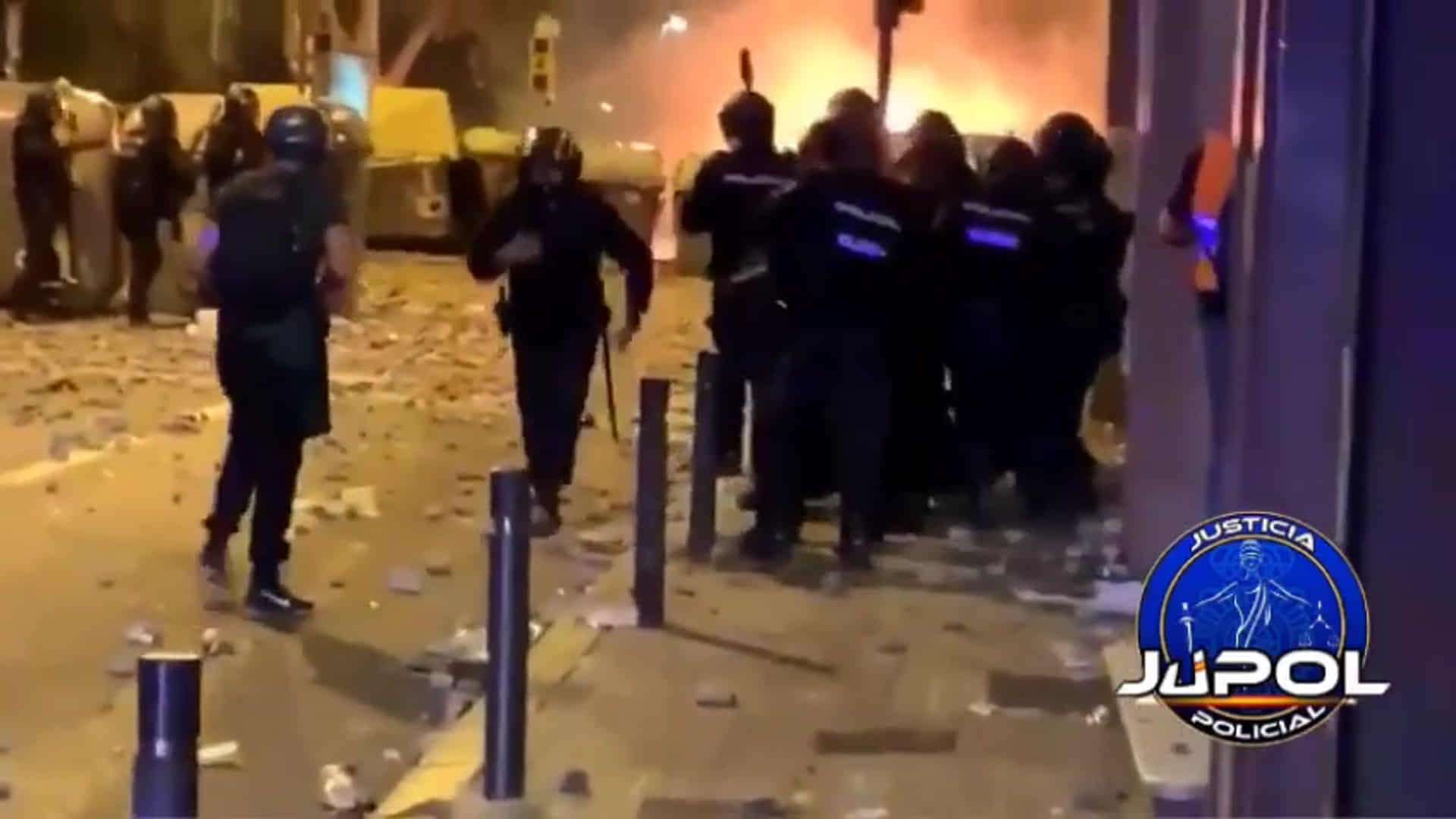 Una vez llegados allí los antidisturbios, el agente describe el siguiente escenario: “Observo que se trataba de una masa de personas en actitud muy violenta, que se dedicaba a lanzar todo tipo de objetos y a cruzar contendores en medio de la calle para formar barricadas, con una organización avanzada, desbordando lo que podíamos considerar un desorden público, puesto que se trataba de una masa perfectamente estructura al estilo Kale Borroka”.