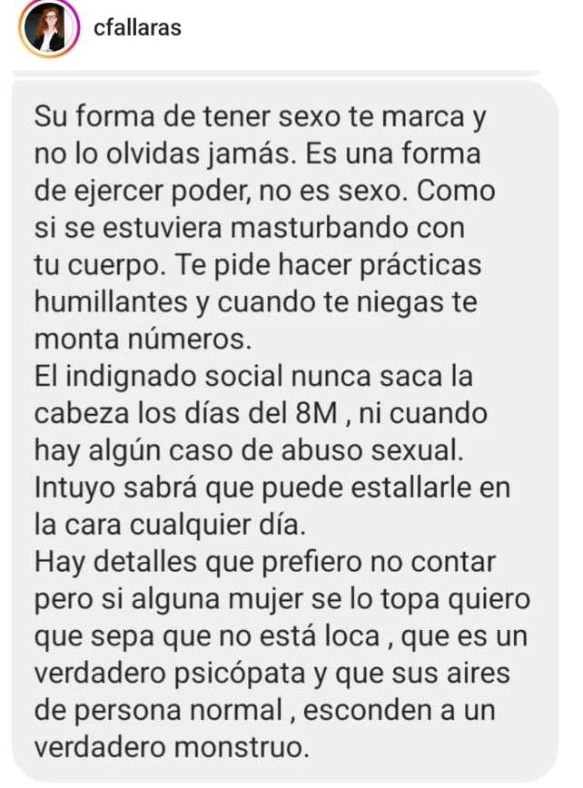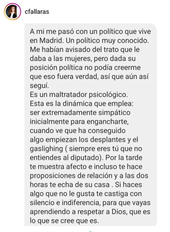 En concreto, esta mañana se divulgaron capturas de un chat de Cristina Fallarás donde recoge las citadas acusaciones. El mensaje reproducido indica que alguien relacionado con el citado movimiento comunista, alto cargo y diputado, es un «verdadero monstruo» maltratador psicológico y sexual de las mujeres a las que atrae haciéndose el simpático, para después humillarlas y tratarlas como un objeto.
