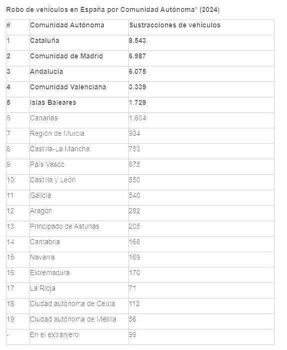 Se sustrajeron 90 automóviles y motocicletas cada día durante todo 2024; encabeza la lista Cataluña, seguida por Madrid y Andalucía