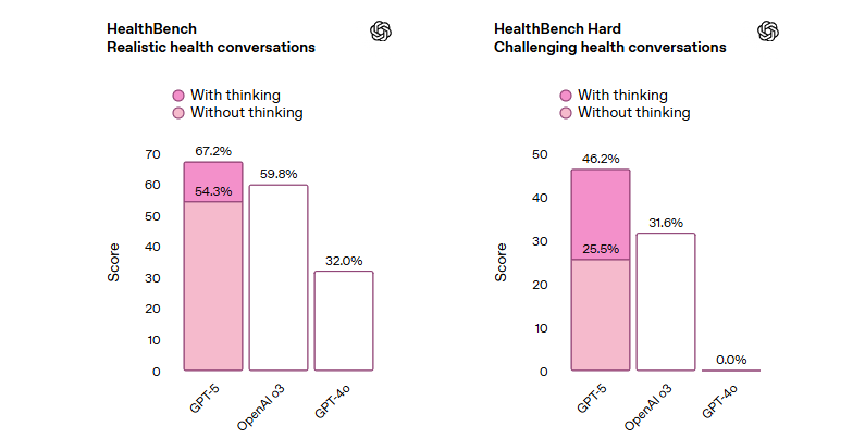 En el campo de la salud, GPT‑5 es el modelo más avanzado desarrollado por OpenAI. En HealthBench, una evaluación basada en escenarios realistas y criterios definidos por médicos, obtuvo resultados sin precedentes. Su capacidad para formular preguntas relevantes, identificar patrones de riesgo y adaptar las respuestas al nivel del usuario lo convierte en un asistente altamente competente.