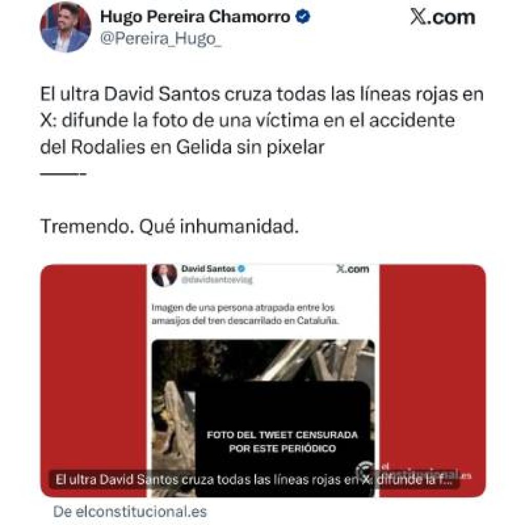El arribista y tertuliano de cuota en TVE, Hugo Pereira, difunde un terrible bulo en X y su panfleto de reciente creación para atacar al comunicador David Santos. En un tuit de su cuenta personal afirma que: “El ultra David Santos cruza todas las líneas rojas en X: difunde la foto de una víctima del accidente de Rodalies en Gelida sin pixelar. Tremendo. Qué inhumanidad”.