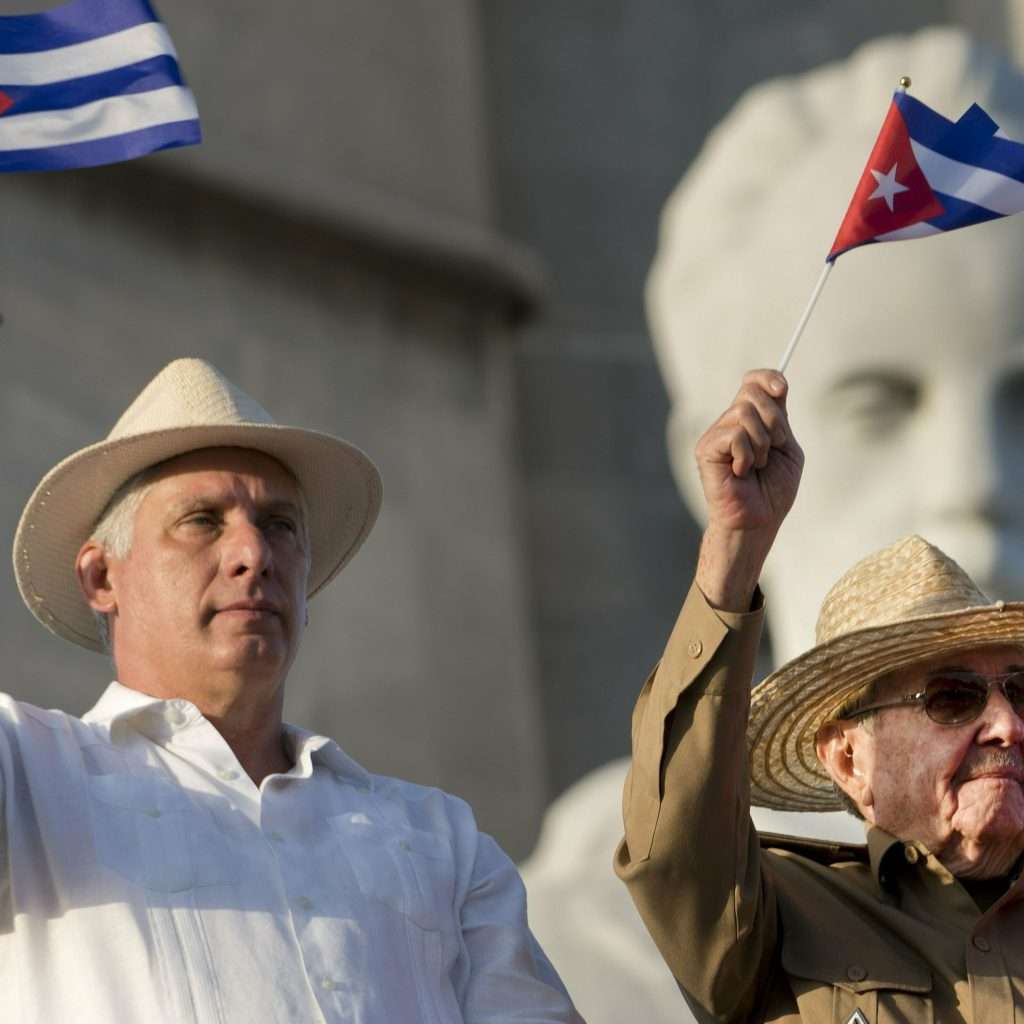 FILE – In this May 1, 2019 file photo, Cuba’s President Miguel Diaz-Canel, left, and former Cuban President Raul Castro wave Cuban flags as they watch the annual May Day parade file past at Revolution Square in Havana, Cuba. On Monday, April 19, 2021, Cuba’s Communist Party congress chose Díaz-Canel to be its leader, adding that post to the title of president he assumed in 2018, replacing his mentor Raul Castro and sealing a political dynasty that had held power since the 1959 revolution. (AP Photo/Ramon Espinosa, File)