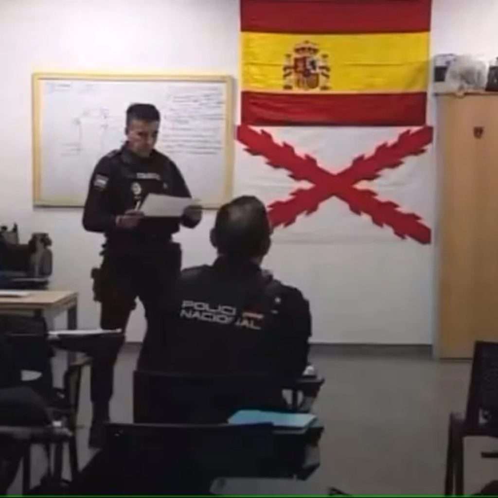 Hablamos de la Cruz de Borgoña que se vio en TVE durante un reportaje sobre los agentes de Policía de Las Palmas y su trabajo de cara a los Carnavales. El vídeo muestra a un inspector dando instrucciones a los agentes y, de fondo, una pared con una bandera de España y, debajo, otra con la cruz de Borgoña.