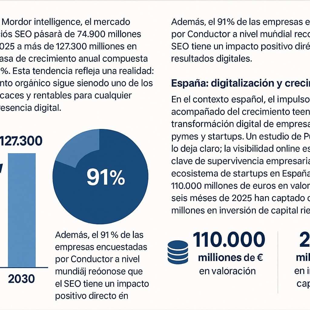 En el contexto español, el impulso al SEO viene acompañado del crecimiento tecnológico y la transformación digital de empresas, especialmente pymes y startups. Un estudio de PuroMarketing lo deja claro: la visibilidad online es hoy un factor clave de supervivencia empresarial. Además, el ecosistema de startups en España ya supera los 110.000 millones de euros en valoración, y en solo seis meses de 2025 han captado casi 2.000 millones en inversión de capital riesgo.