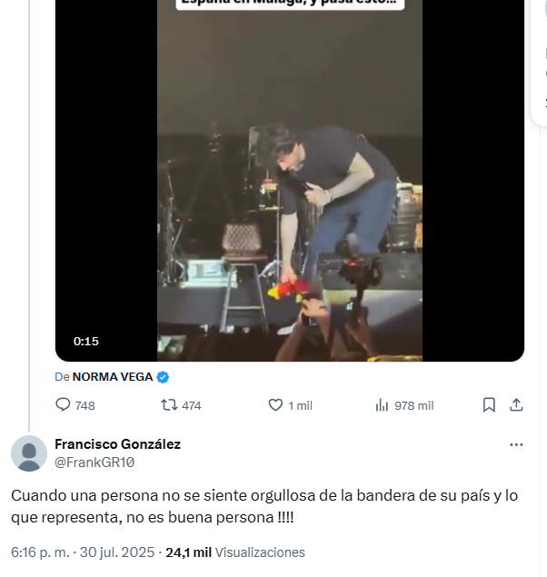 El momento se ha hecho viral en X (antes Twitter), donde una usuaria publicó el vídeo con esta frase, acompañada de miles de interacciones. En él se ve al cantante hablando animadamente con el público y reconociendo con simpatía a un fan que portaba una bufanda de su equipo de fútbol, el Real Oviedo. Justo entonces, una bandera de España enrollada en forma de bola llega al escenario. Su reacción fue clara: la apartó con discreción y continuó con el show.