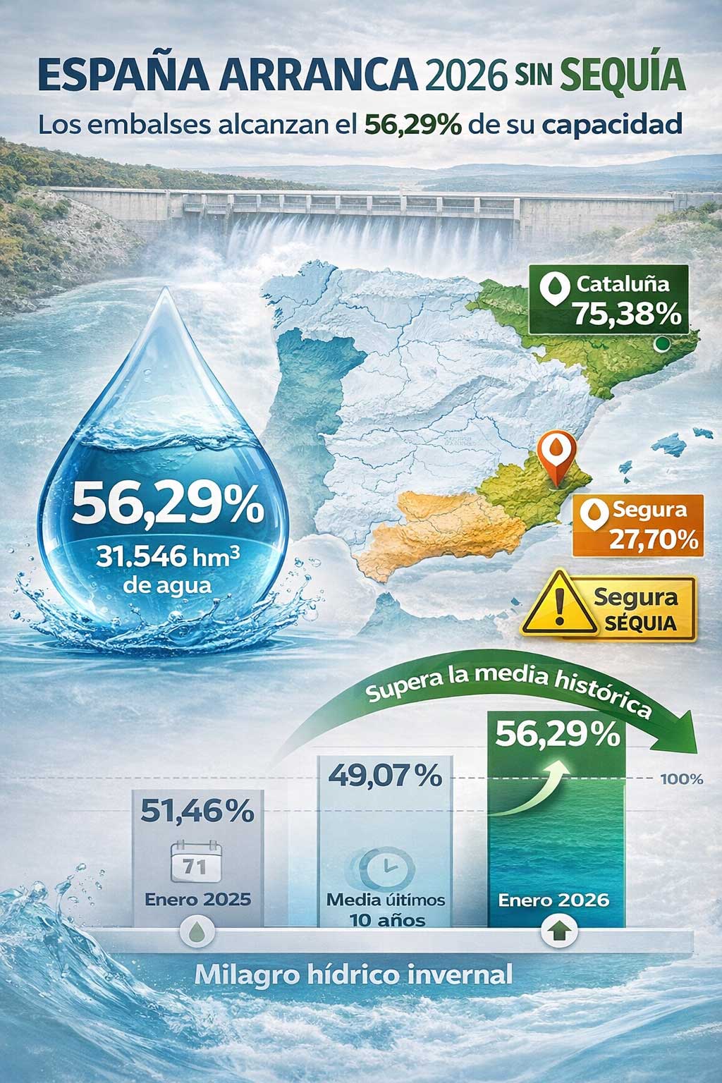 España comienza 2026 con una noticia que parecía imposible hace solo un año: el fantasma de la sequía se aleja. Los datos oficiales actualizados a 7 de enero confirman un milagro hídrico invernal. Los embalses españoles acumulan 31.546 hectómetros cúbicos de agua, situándose al 56,29% de su capacidad total. Esta cifra no solo mejora sustancialmente el 51,46% registrado en estas mismas fechas de 2025, sino que logra algo histórico: superar la media de los últimos diez años (49,07%).