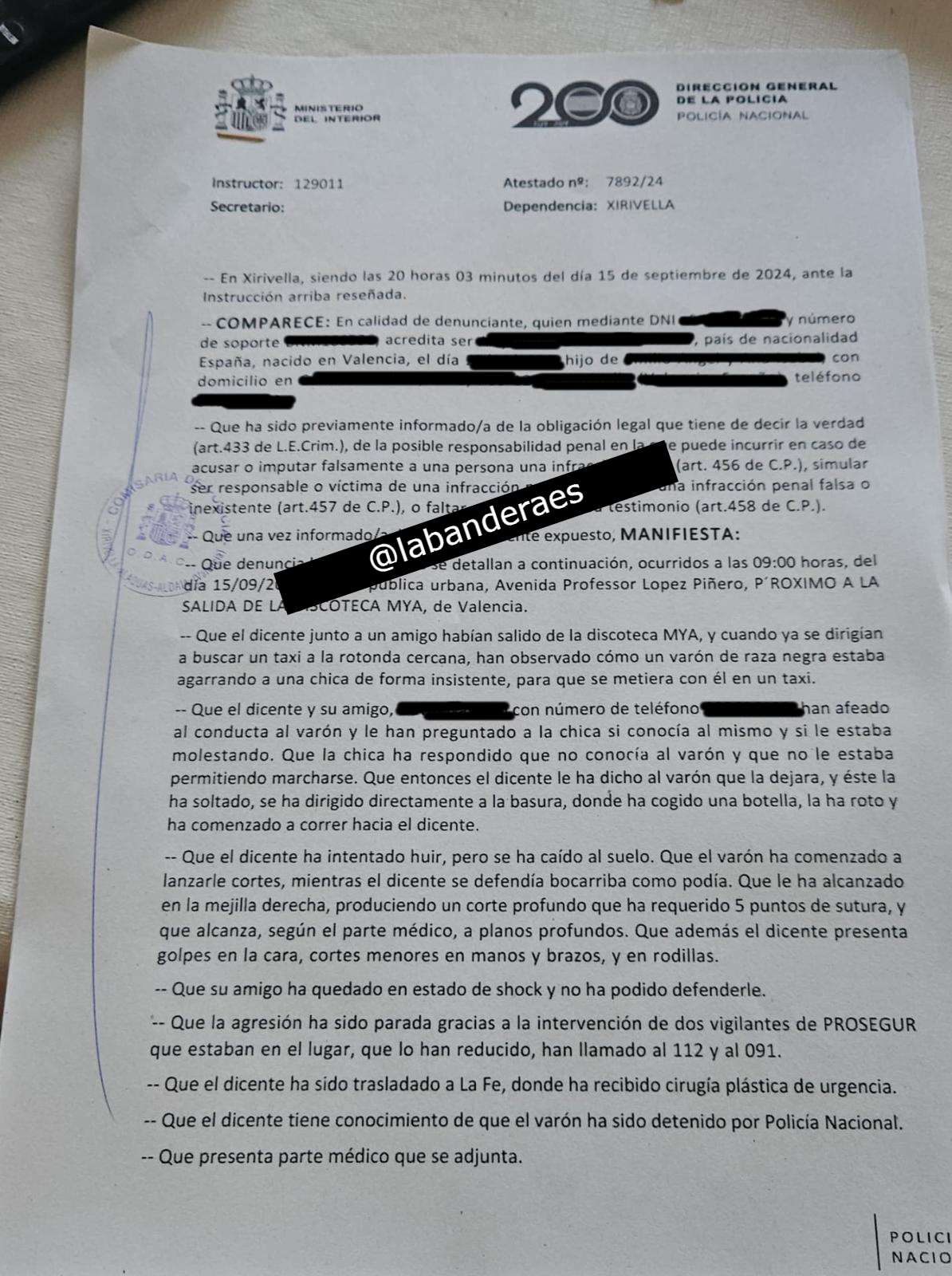 Tal y como relata la denuncia, en exclusiva en La Bandera, los hechos ocurrieron el pasado 15 de septiembre sobre las 09:00 horas de la mañana. El joven estaba con un amigo y al salir de una discoteca, observaron a «un varón de raza negra agarrando a una chica de forma insistente, para que se metiera con él en el taxi«.